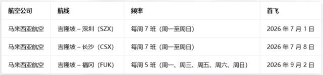 自 2026 年 7 月起,马航将正式开通两条中国全新直飞航线:吉隆坡↔深圳(SZX) 于 7 月 1 日首航,吉隆坡↔长沙(CSX) 于 7 月 8 日首航,两条航线均为每周 7 班(每日一班) 高频运营.